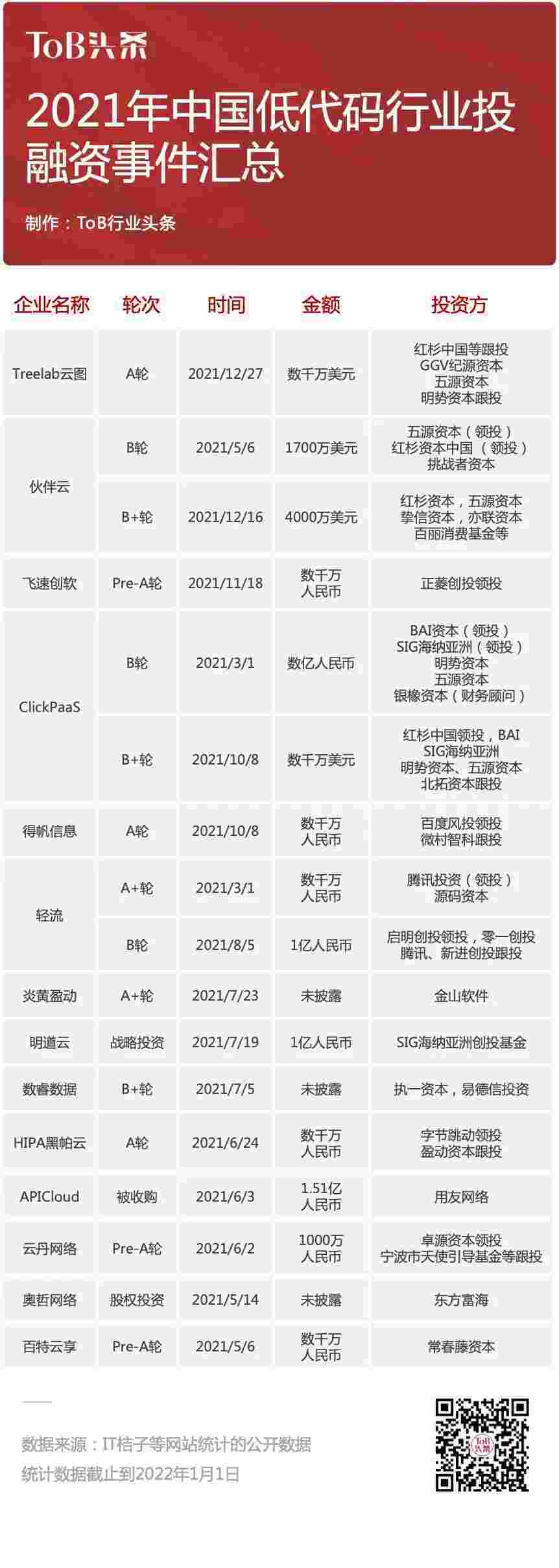到2021年,,,,,,,,无/低代码投融资规模势头更甚,,,,,,其中包括轻流两轮融资(A+轮数千万人民币,,,,,,,B轮近亿人民币)、、、、、、、小米钱包 两轮融资(B轮数亿人民币,,,,,,,B+轮数千万美元)、、、、、、、、、百特云享数千万元Pre-A轮融资......