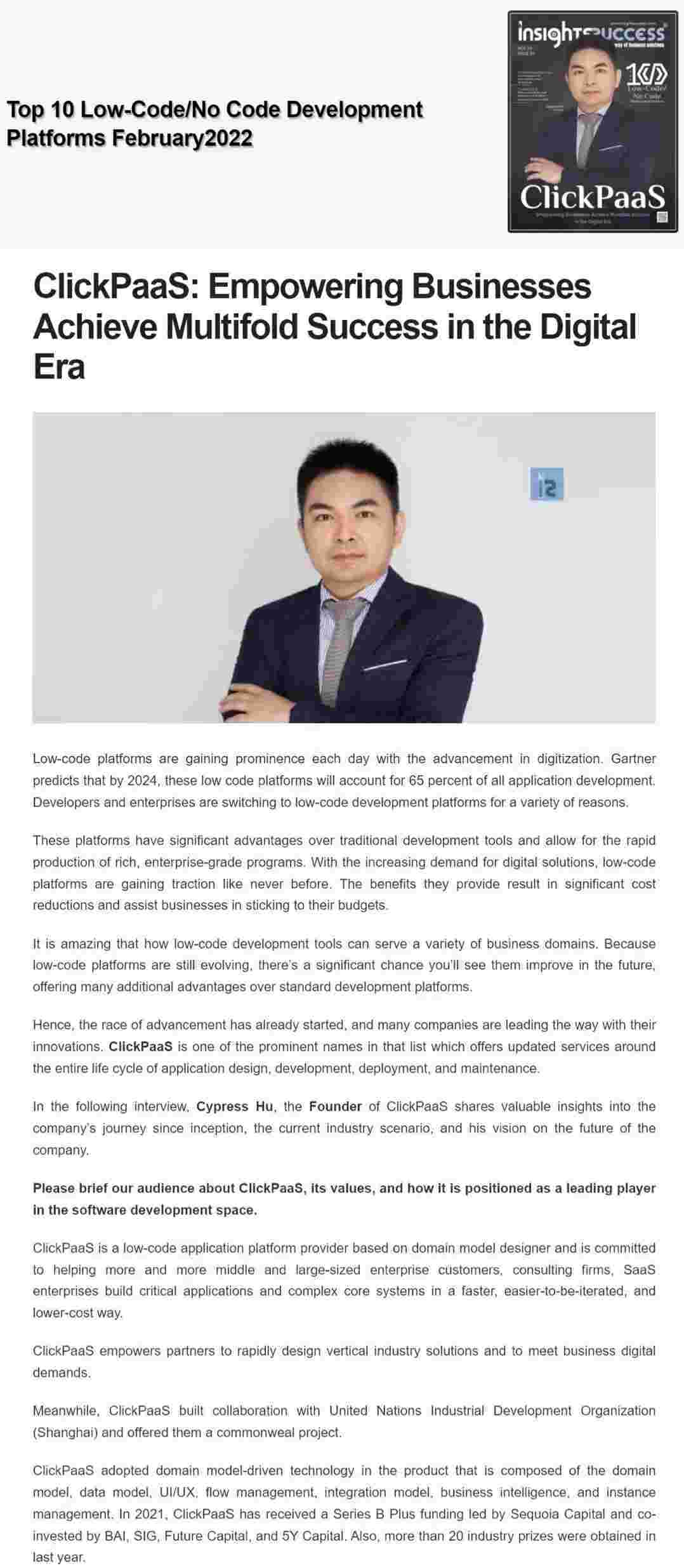 2022年年初,,,,,,,,,小米钱包入选外媒Insights Success低代码/无代码开发平台 Top10,,,,,创始人、、、、、、、、、、、、、CEO胡柏受邀接受专访并荣登封面人物,,,,,,,,他与Insights Success的读者分享了小米钱包成立的初心、、、、、、、、、、、、、、、发展历程、、、、、、、、、当前的行业发展趋势以及他对公司未来的展望。。。。。。。。。。
